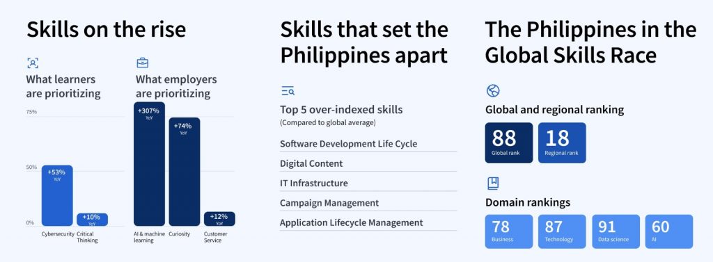This progress aligns with national efforts to upskill one million AI-skilled workers by 2028, as part of broader digitalization goals. 86% of Filipino knowledge workers already use AI at work – well above the global average of 75% and regional average of 83%. This trend is also echoed by learner behavior on Coursera, with a sharp rise in enrollments in courses that equip learners with skills that employers are prioritizing: AI and ML by 307%, Curiosity by 74%, Customer Service rose by 12% and Critical Thinking by 10%.